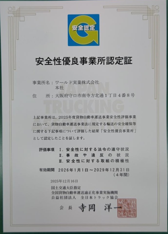 ワールド実業株式会社において「2025年度 安全性優良事業所認定証(Gマーク)」更新の証書を受領いたしました。 乗務員を始め、運行管理者、お取引先各社様による、「安全運行・無事故・無違反」への実践とご協力によるものだと認識しております。ありがとうございます。 今後も引き続き、日々安全運行・無事故への推進に努めて参ります。宜しくお願い申し上げます。